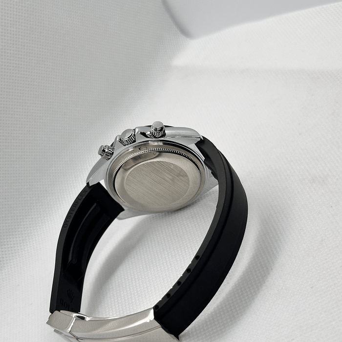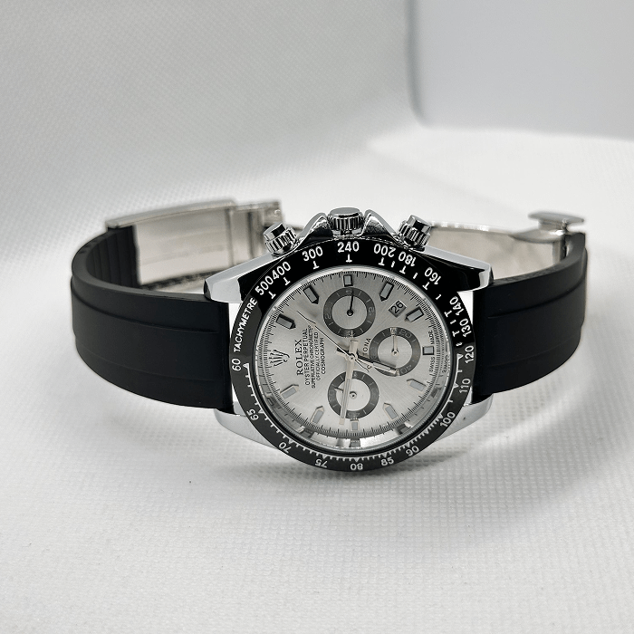 A men’s Rolex Daytona-style chronograph watch with a stainless steel case, a silver dial with three sub-dials, and a black bezel with a tachymeter scale. It is fitted with a black rubber strap.