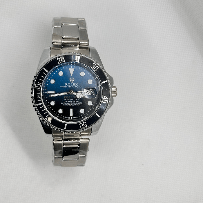 A Rolex Sea-Dweller with a stainless steel case, a black dial and bezel, and a steel bracelet.